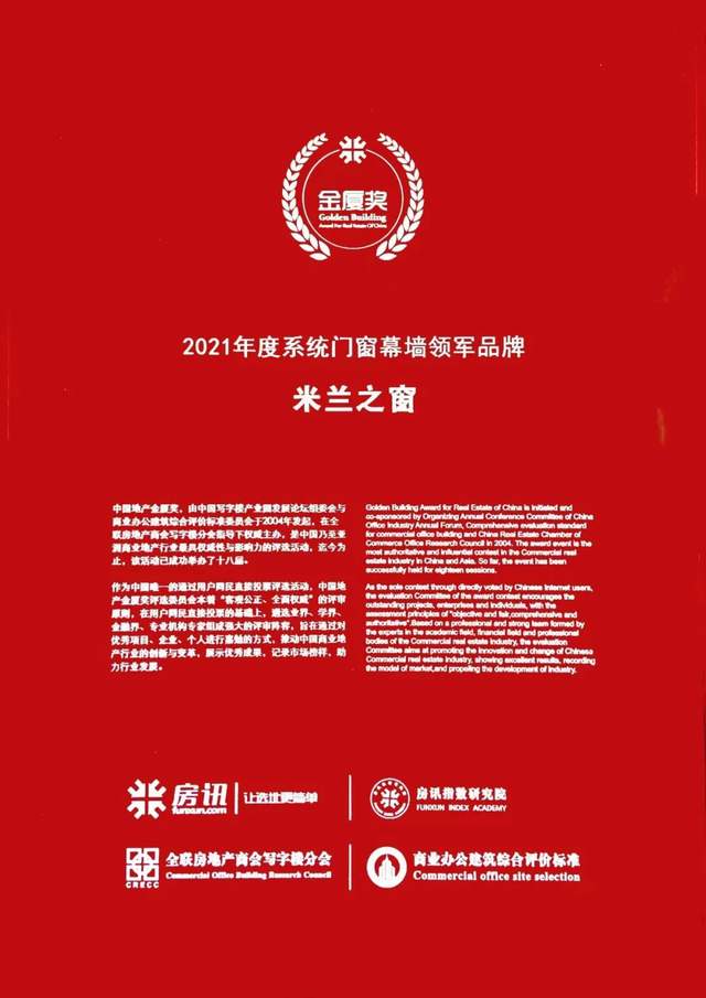 此次榮獲中國地產(chǎn)金廈獎——“2021年度系統(tǒng)門窗幕墻領(lǐng)軍品牌”,離不開各界對米蘭之窗的認(rèn)可與支持。榮譽(yù)與責(zé)任并行,未來米蘭之家將持續(xù)致力于樹立中國系統(tǒng)門窗行業(yè)標(biāo)桿,引領(lǐng)行業(yè)發(fā)展,為推動中國房地產(chǎn)良好發(fā)展作出更大的貢獻(xiàn)。